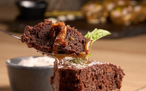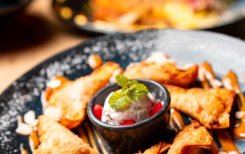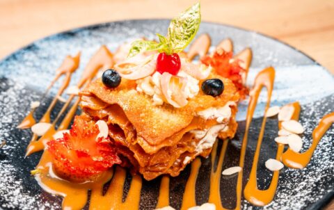 Capas de wonton crocantes rellenas de dulce de leche, crema de liches, sal, fresa, arándanos y merengue.