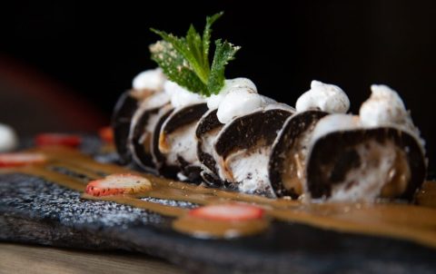 Rollo de nutella, oreo, arequipe, helado, almendras, envuelto en papel de arroz, chantilly dorada