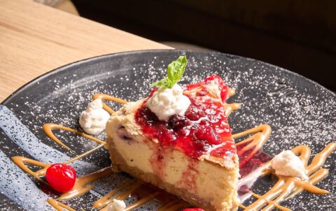 Batido de quesos, frutos rojos, sobre base de galleta crocante.